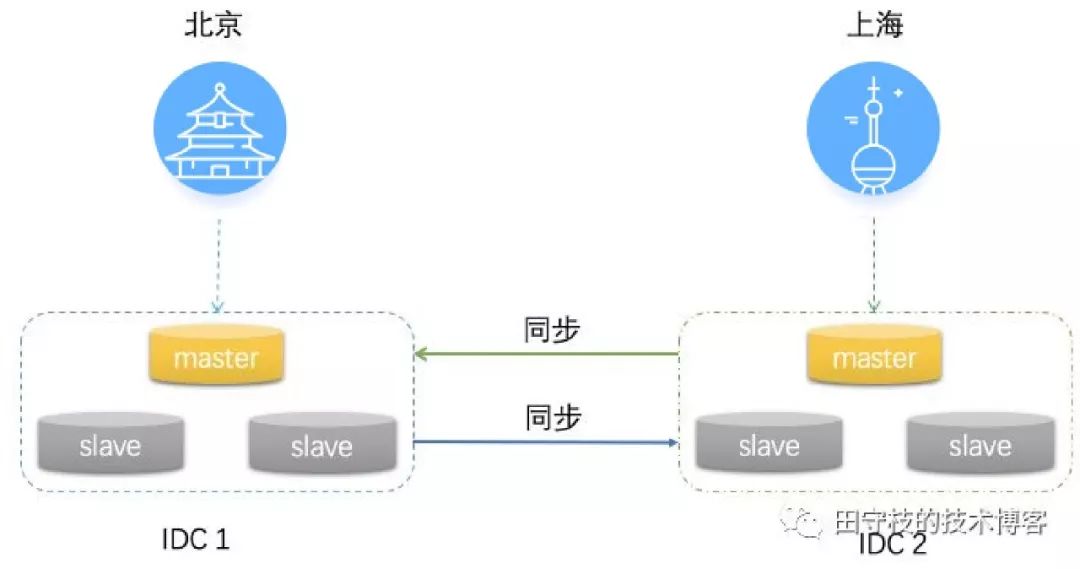 为了解决这些问题,我们可以将服务部署到多个不同的IDC中,不同IDC之间的数据互相进行同步。如下图: