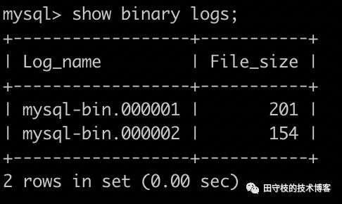 另外一些mysql 的分支,如percona server,还可以指定保留binlog文件的个数。我们可以通过show binary logs来查看当前mysql存在多少个binlog文件,如下图: