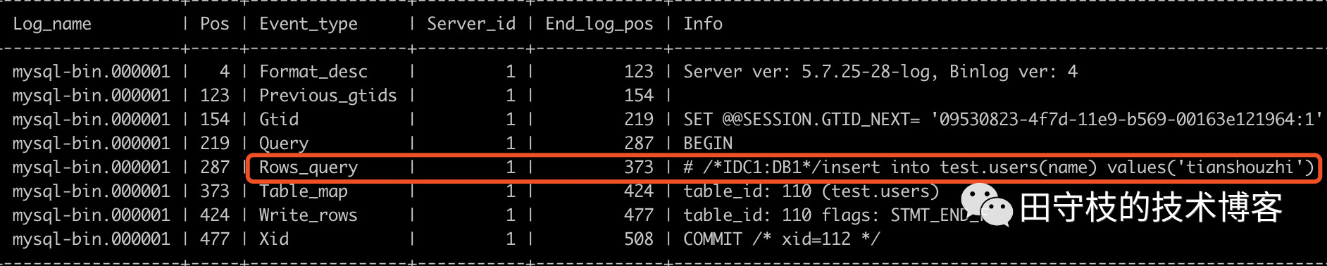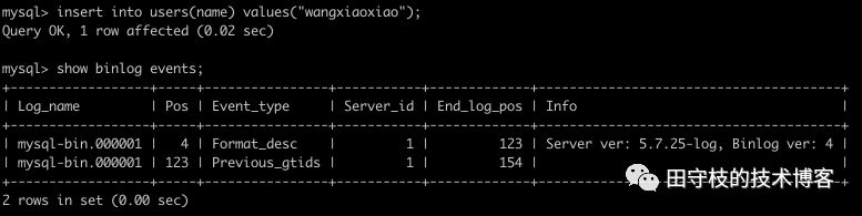 mysql> SET GTID_NEXT= '09530823-4f7d-11e9-b569-00163e121964:1';Query OK, 0 rows affected (0.00 sec)mysql> insert into users(name) values("tianbowen");Query OK, 0 rows affected (0.01 sec) #注意这里,影响的记录行数为0