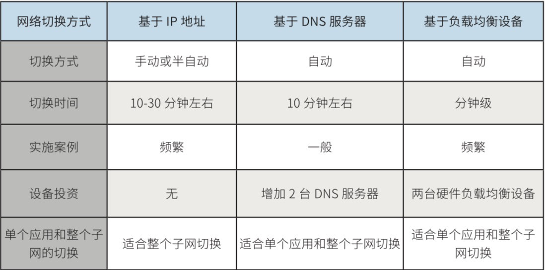 网络切换技术主要有三种:基于 IP 地址的切换、基于 DNS 服务器的切换、基于负载均衡设备的切换。