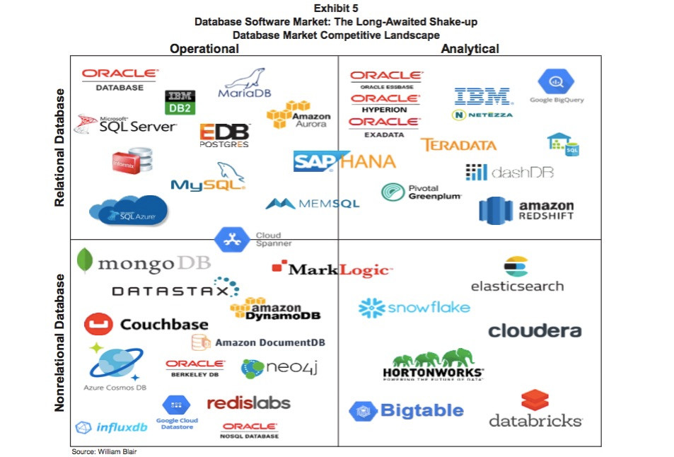 交易型数据库的4个巨头仍然是Oracle、微软、IBM和SAP,在这里William Blair将他们归为第一阵营。