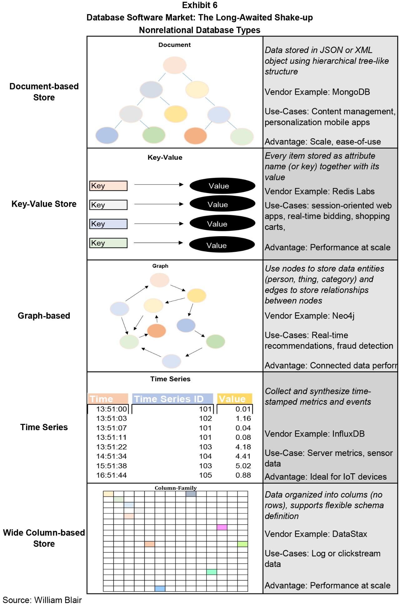 显然非关系型数据库的分类要更加复杂,产品在应用中的差异化也比传统关系型数据库更大。Willian Blair很负责任地对它们给出了进一步的分类。
