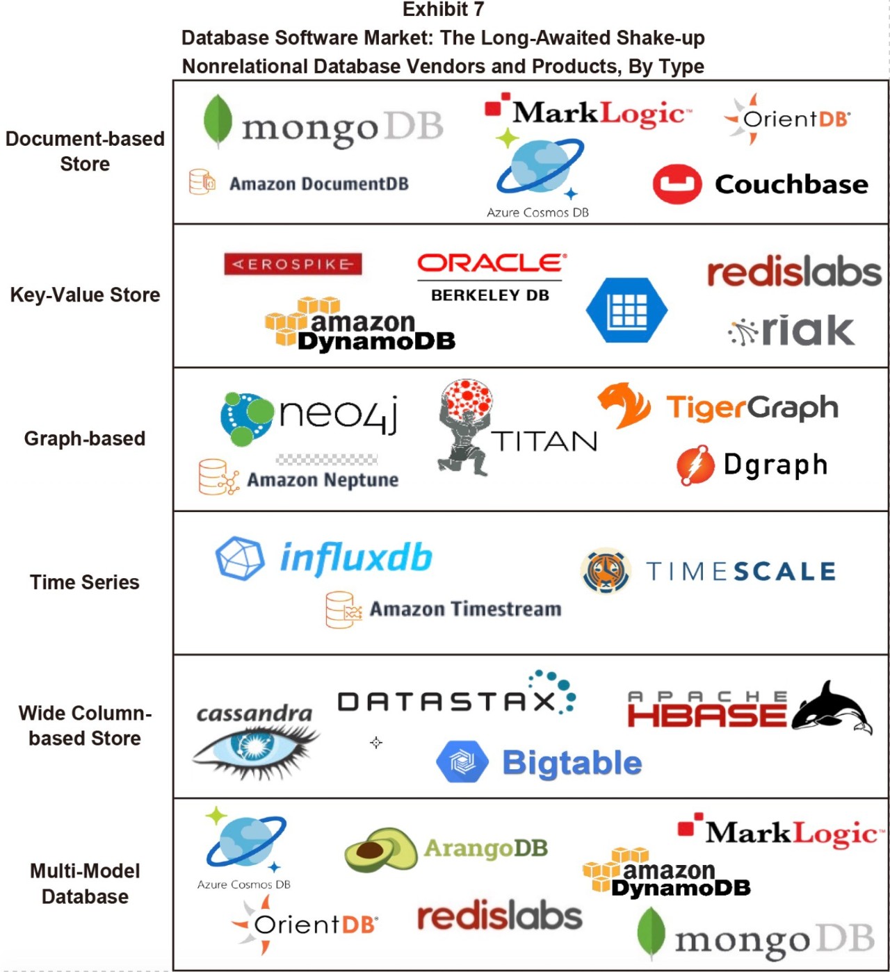 多模型数据库:支持上面不只一种类别特性的NoSQL,比如MongoDB、Redis Labs、Amazon DynamoDB和Azure Cosmos DB等。