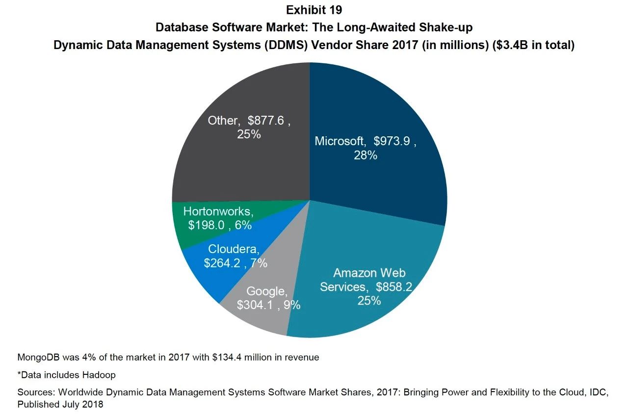 代表非关系型数据库的DDMS分类中(这里同样加入Hadoop等),云服务和新兴厂商成为了主导,微软应该是因为云SQL Server的基础而小幅领先于AWS,这两家一共占据超过50%的市场,接下来的排名是Google、Cloudera和Hortonworks(二者加起来13%)。