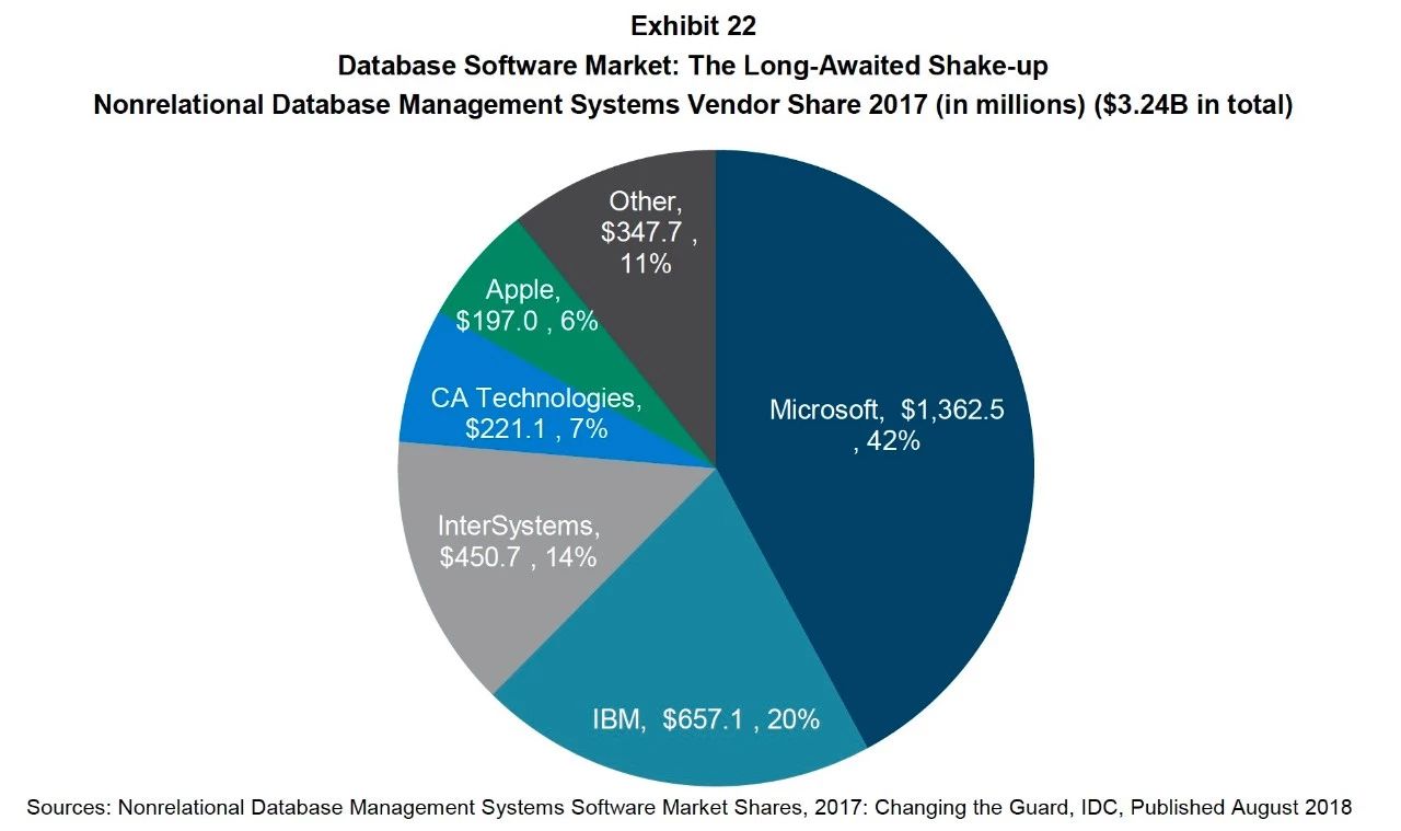 上面是IDC传统分类中的“非关系型数据库”,在这里IBM和CA等应该主要是针对大型机的产品,InterSystems有一款在国内医疗HIS系统中应用的Caché数据库(以前也是运行在Power小机上比较多)。