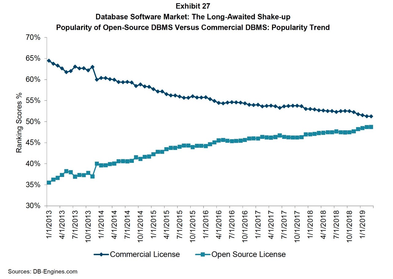 按照流行度来看,开源数据库从2013年到现在一直呈现增长,已经快要追上商业数据库了。