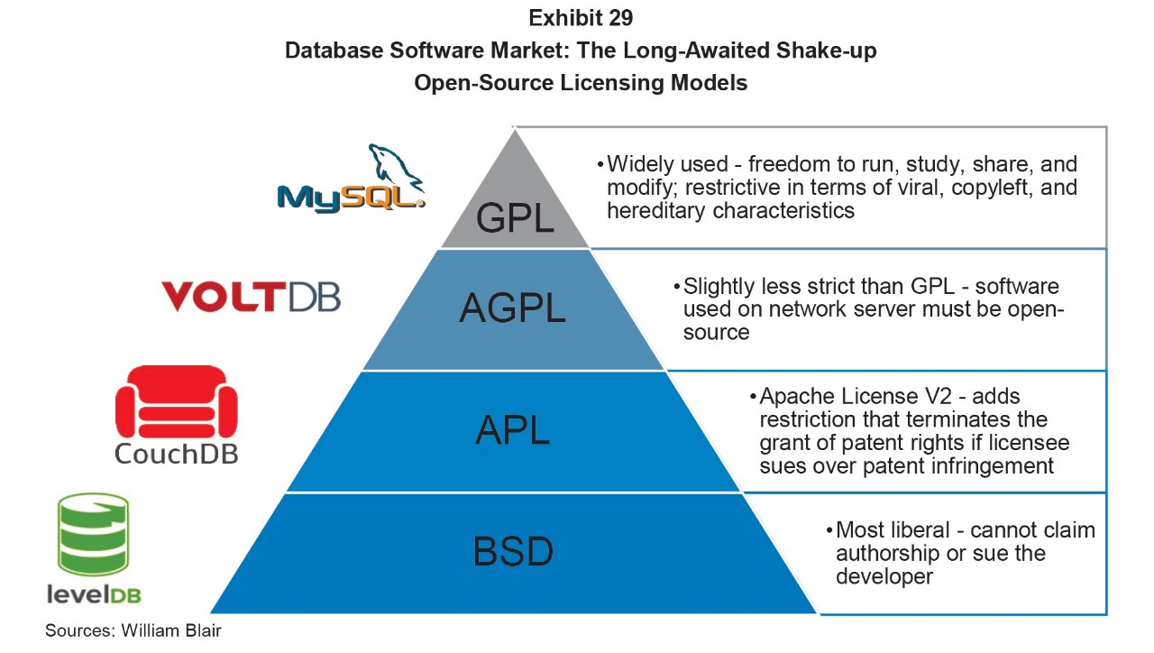 按照开源License的授权模式,下面这个三角形越往下管的越宽松。比如MySQL属于GPL,在互联网行业用户较多;而PostgreSQL属于BSD授权,国内有不少数据库公司的产品就是基于Postgre哦。