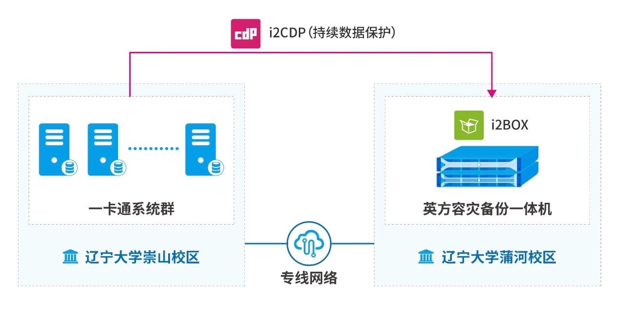 相比于同机房容灾而言,异地灾备的主要作用是在主生产中心遭遇自然灾害或人为破坏时,异地灾备中心能够快速进行数据恢复以及业务的实时切换,从而保证业务连续运行。由于异地灾备的特点在于“异地”,因此英方软件的技术专家建议,在异地灾备中心的选择上,需要根据具体的灾备技术和网络情况进行选择,既需要保证一个有效的距离,也需要保证网络的传输效率。辽宁大学崇山校区与蒲河校区距离约12公里,两个校区的数据中心有专线连接,这一得天独厚的区位优势,既保证了数据的传输速度,同时也符合异地容灾的需求。